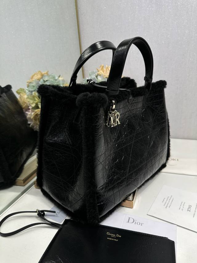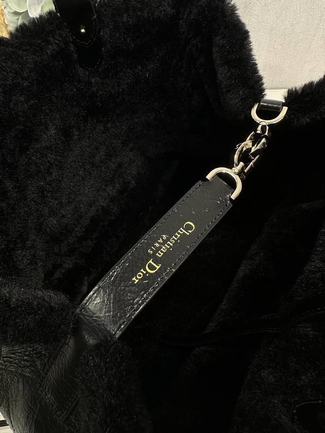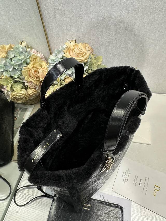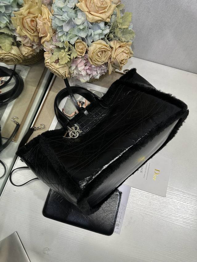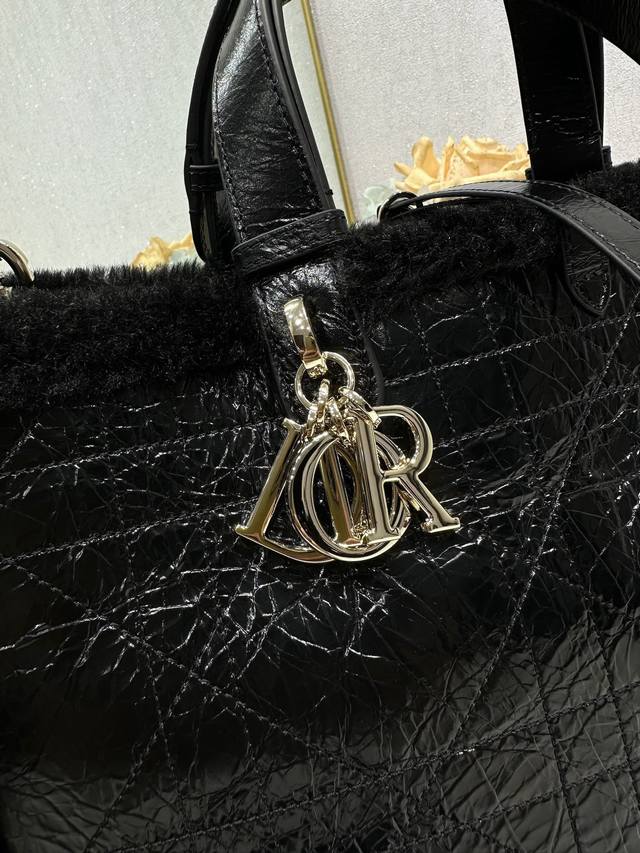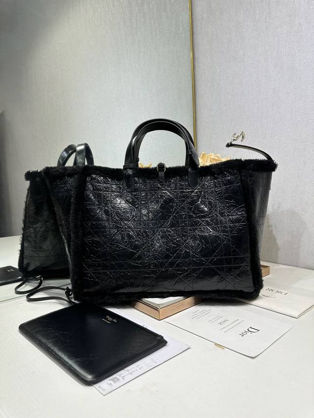 Top-Tier Original Large D Ior Toujours Handbag with Cracked Black and Black Fur Trim DDD Black Cracked Leather and Black Fur Trim# DDD This D Ior Toujours handbag made a stunning debut in the 2024 Winter collection, featuring a unique blend of casual and practical design. Crafted from meticulously cut cracked black calfskin with oversized cannage stitching, its spacious interior compartments and small pouches offer neat organization for everyday essentials. It features a leather drawstring closure for secure storage, and a Cd Lock D-shaped knob closure that is adjustable on both sides for added style. The large size includes an adjustable leather handle for easy carrying. Double-closing design: slim tie and Christian Dior Paris tie with CD Lock buckle. DIOR charm. Detachable internal pocket. Adjustable leather handle. Model: 1188. Dimensions: 37 x 27 x 21 cm (L x H x W). Spacious enough to hold a 15-inch laptop, a small pocket, a mobile phone, two card holders, sunglasses, and lipstick.