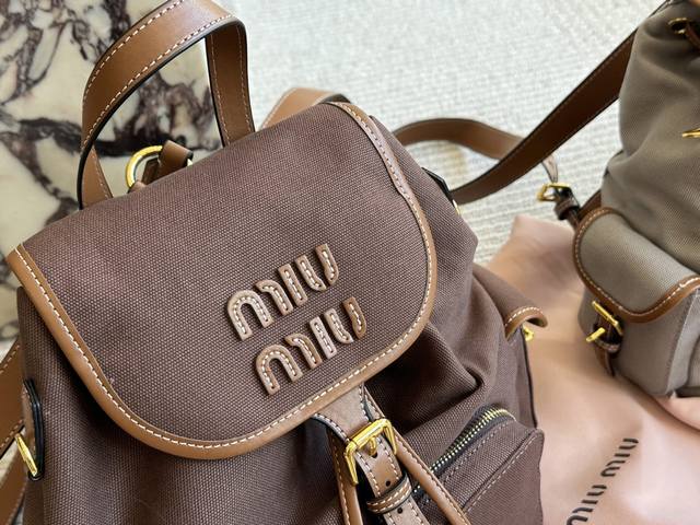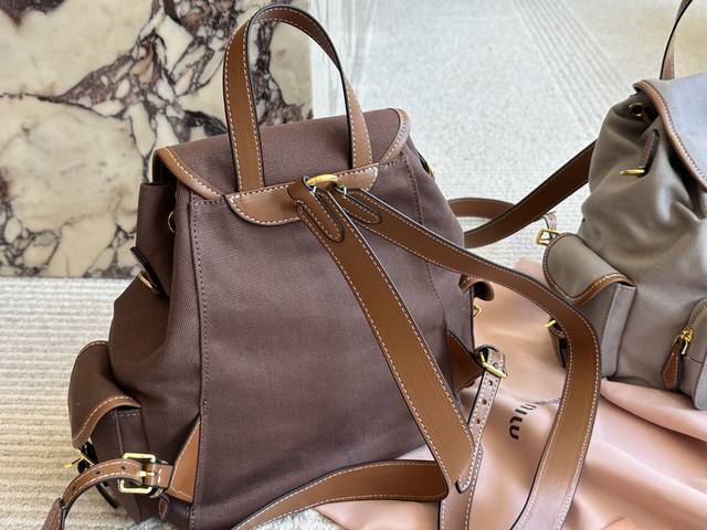 Eye-catching yet sophisticated, the "Miu Miu" logo highlights the brand's style, and it's super attractive and simple when carried. The leather material is full of texture, and the multiple pockets are practical and convenient, making it suitable for commuting or traveling. Blue backpack: The calm blue is paired with brown leather details, and the color collision creates a unique beauty. The drawstring closure adds casualness, combining beauty with practicality.