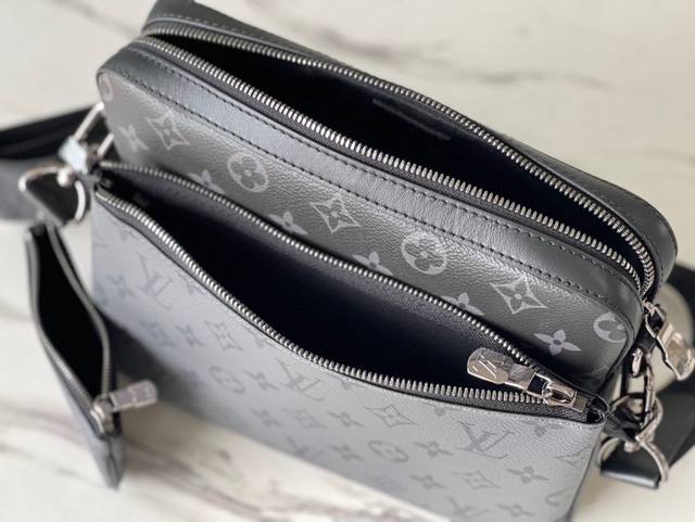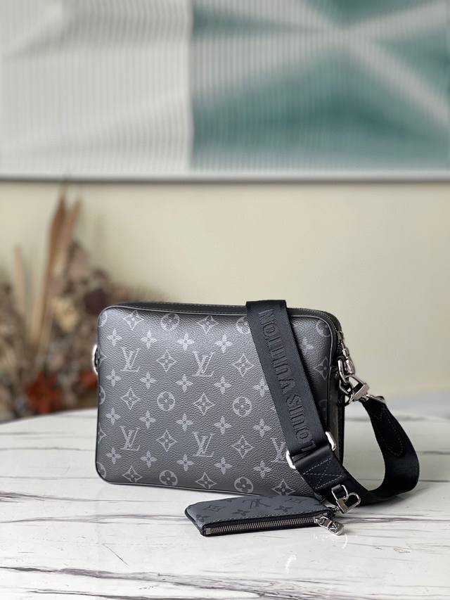 Top-Tier Original Factory M69443 Trio Messenger Bag Made From Monogram Eclipse Canvas And Monogram Eclipse Reverse Canvas. The Iconic Monochromatic Gray Pattern Highlights The Sleek Lines Of This Versatile Mix-And-Match Design. In Addition To Traditional Crossbody Bag Functionality, It Features A Detachable Zippered Pouch And A Coin Purse Attached To The Strap.Dimensions: 25 X 18.5 X 7 Cm