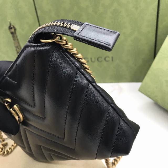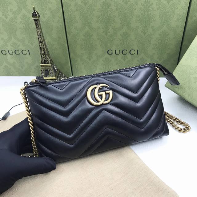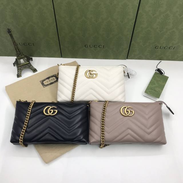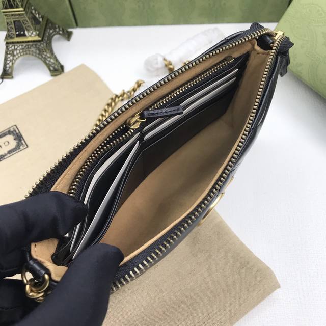 Original leather with green box, a popular G brand item, boutique quality, authentic original, real product photos. Style number: 443447. Available in quilted genuine leather, white leather, and milk tea color. This G chain bag is meticulously crafted from genuine leather, featuring a human figure pattern and the GG logo on the back. It has 6 card slots and 1 zippered inner pocket. Dimensions: 22cm wide x 13cm high x 3.5cm deep. In stock!