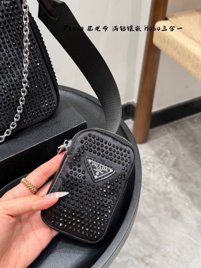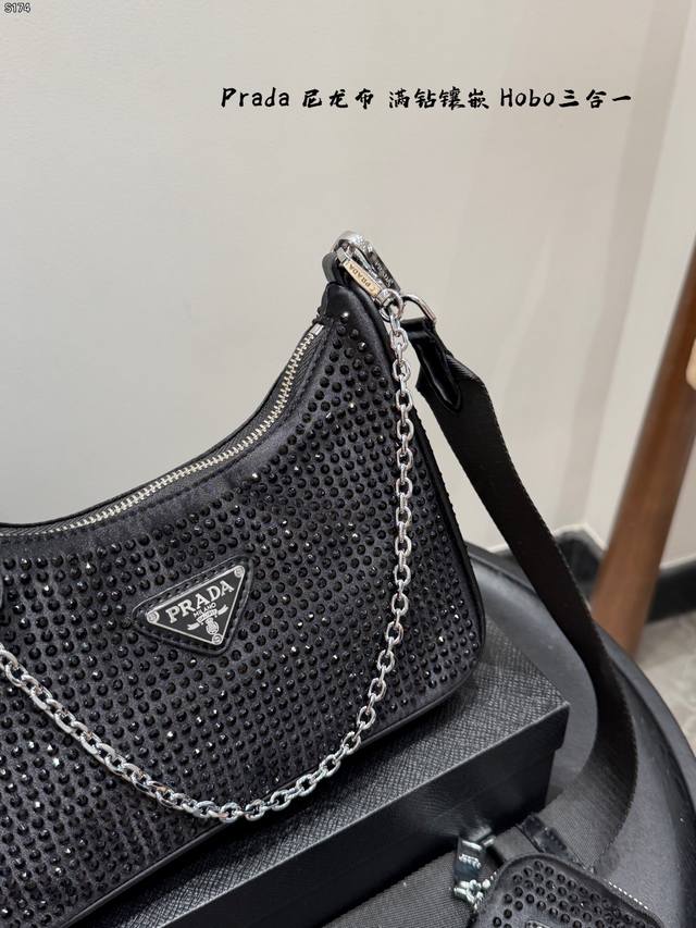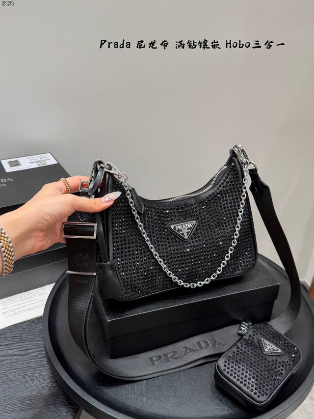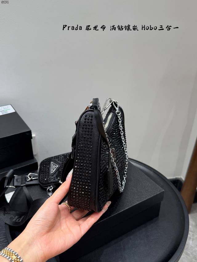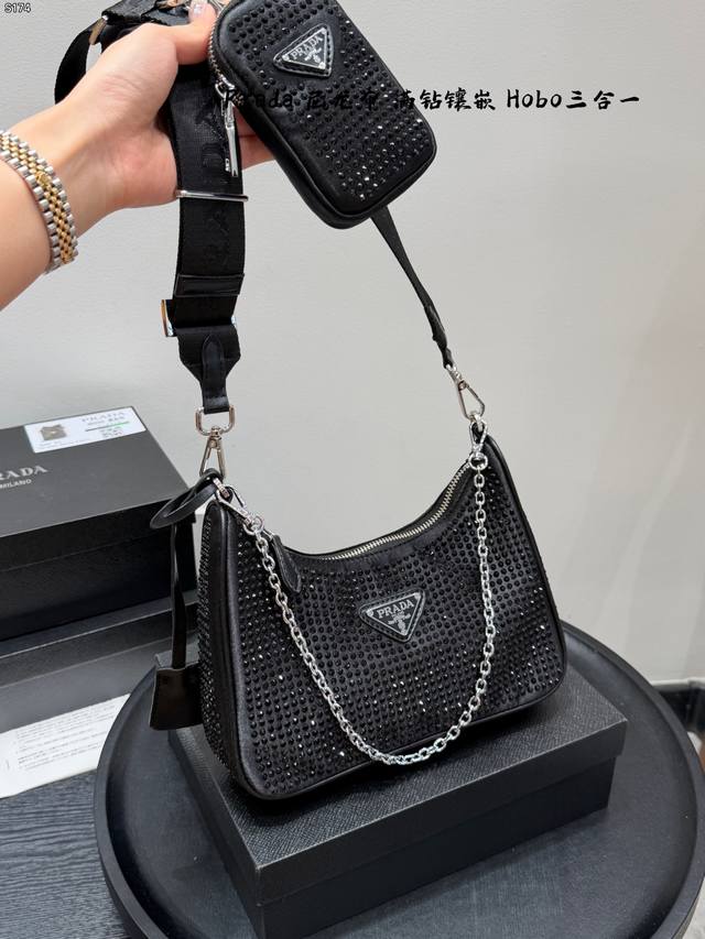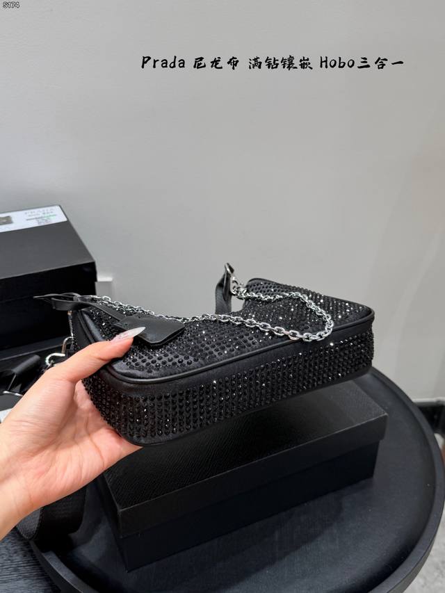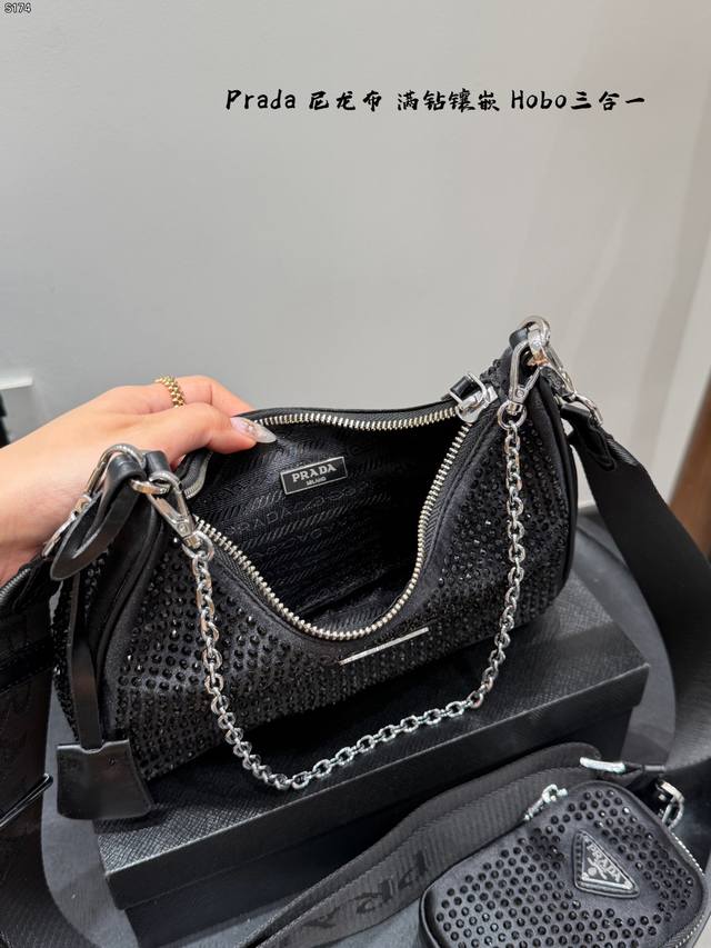 Gift Box Packaging DDD Size: 22cm Ddd Prada New Nylon Fully Rhinestone-Encrusted Hobo 3-in-1 Shoulder Bag Ddd Nylon material with heavy-duty rivet and perforation craftsmanship Ddd Easily creates a cool and stylish look with a burst of fashion sense Ddd Carry it and you'll get 100% attention Ddd