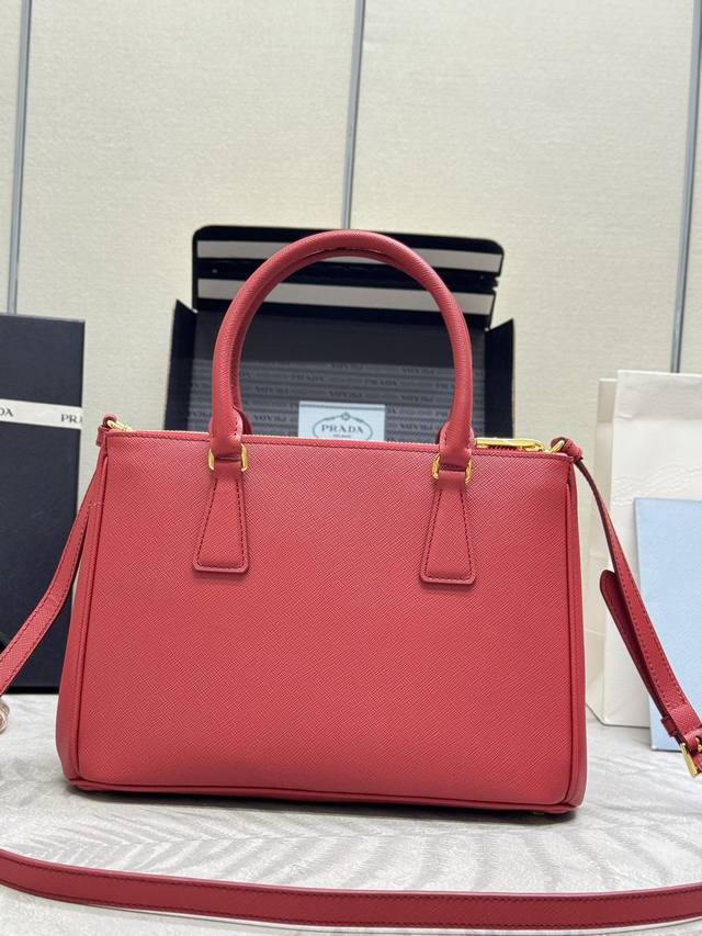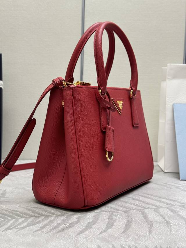 Medium 1Ba863 Popular 28cm Killer Bag, Saffiano leather, double leather handles, detachable and adjustable leather shoulder strap, gold-plated hardware, triangular leather with metal engraved logo, side snap closure, two zippered exterior pockets, three interior pockets including one zippered pocket, Prad logo lining. Dimensions: 28
