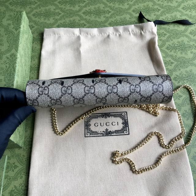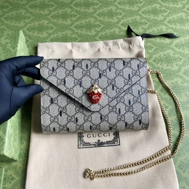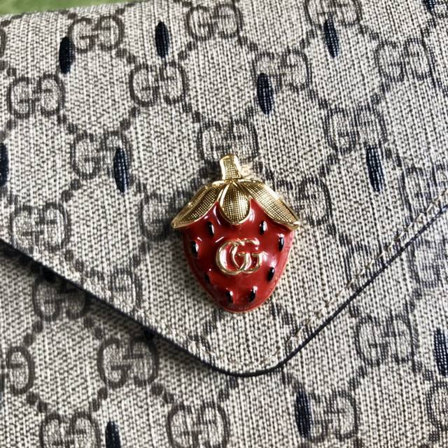 The fruit motif on the premium version carries the brand's playful narrative, constantly adding color to the design. The strawberry is presented in a variety of forms, often paired with iconic brand design elements. On this beige and ebony Gg Supreme mini bag, it complements the Double G design. Model No. 726249, 19cm wide x 14.5cm high x 2cm deep