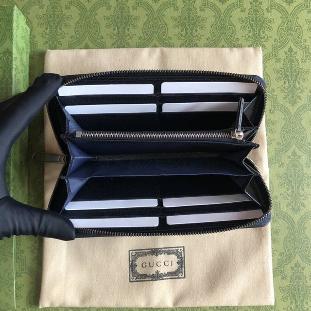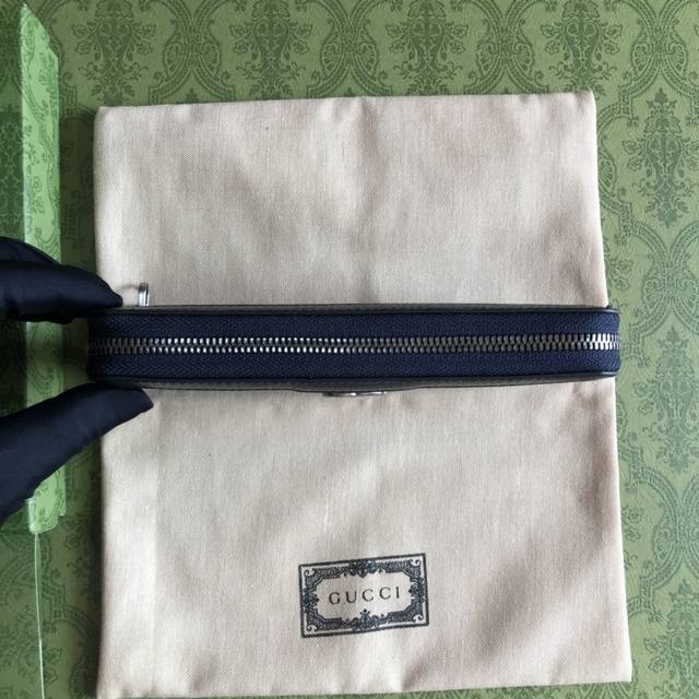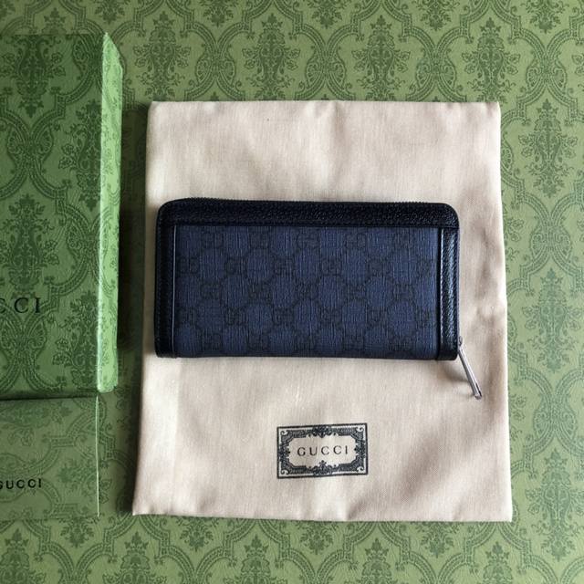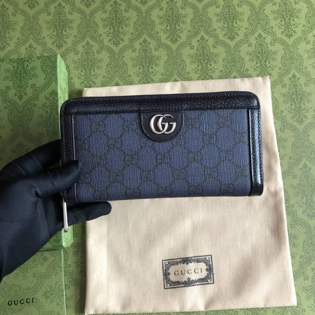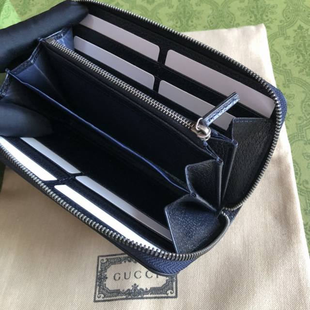 The premium G Ophida zip-around wallet, 706844, features blue and navy Supreme canvas with navy leather trim for a modern and stylish look. Palladium-tone hardware adds a touch of class. Features 12 card slots, 3 bill compartments, a zippered coin pocket, and a full zipper closure.