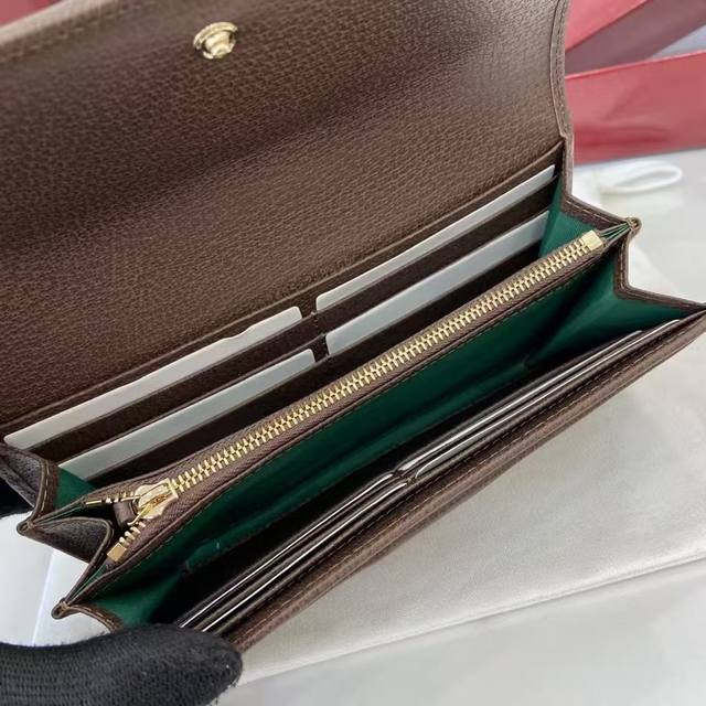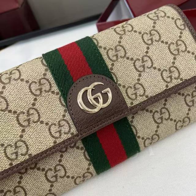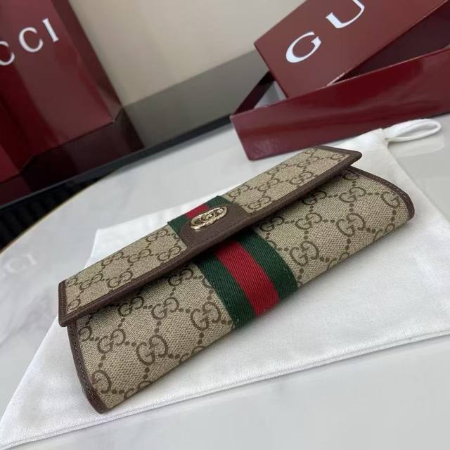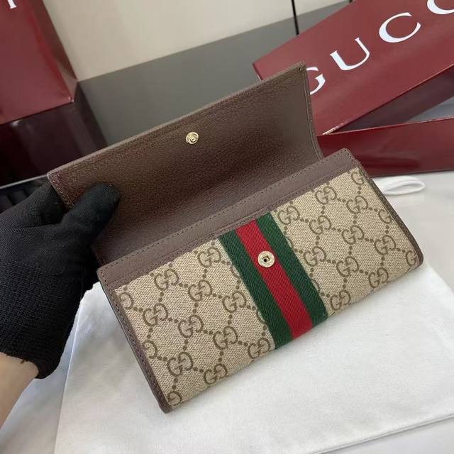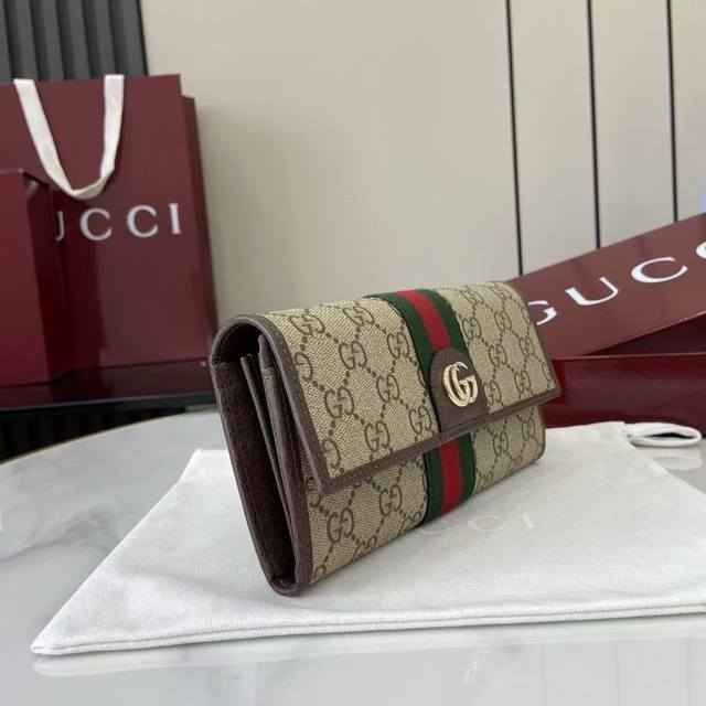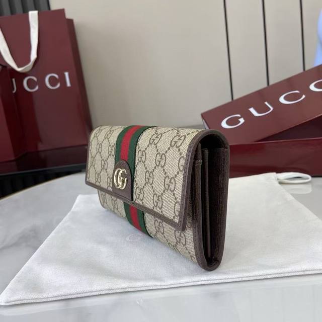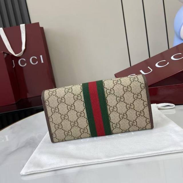 The premium new Ophidia collection showcases striking new silhouettes and practical, functional designs, expertly crafted in the signature beige and brown colorway to create soft accessories. This long wallet is a signature piece.