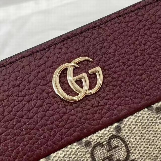 The top-of-the-line Double G hardware, inspired by a classic 1970s design, continues to shine in the Gg Marmont collection. This card holder is crafted from beige and ancora red Gg Supreme canvas with ancora red leather details.