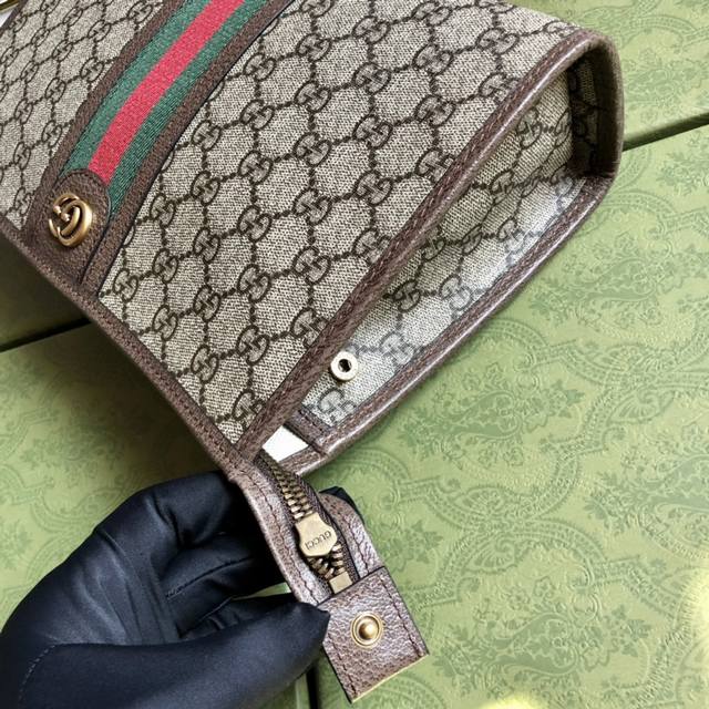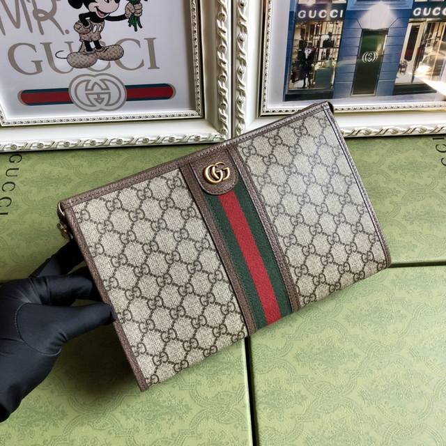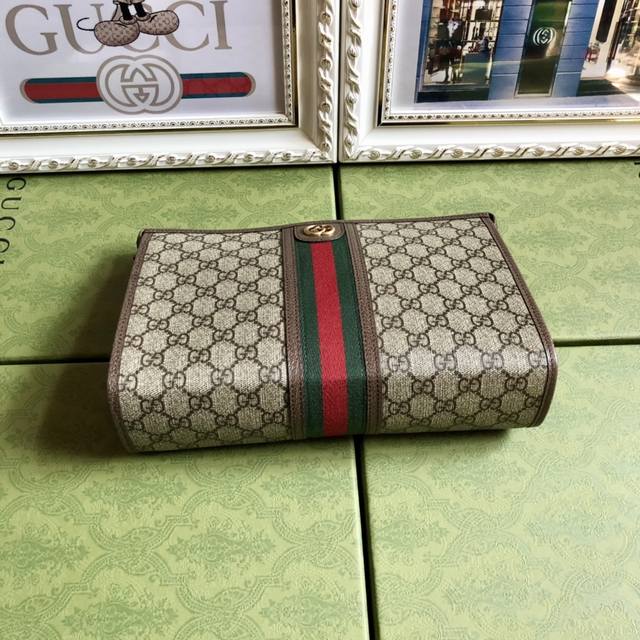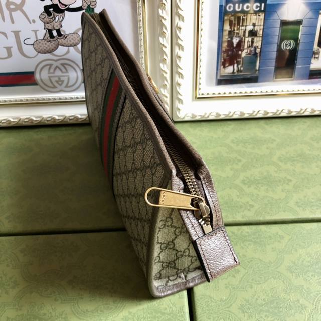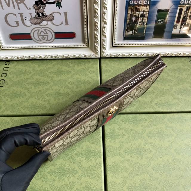 The top-of-the-line, premium-quality Ophidia series continues the inspiration of the previous ultra-thin zipper Gg Supreme high-end artificial canvas clutch, with an Italian cowhide zipper inner pocket. Structured and fashionable design. Model: 598234 PVC brown. Dimensions: W28.5