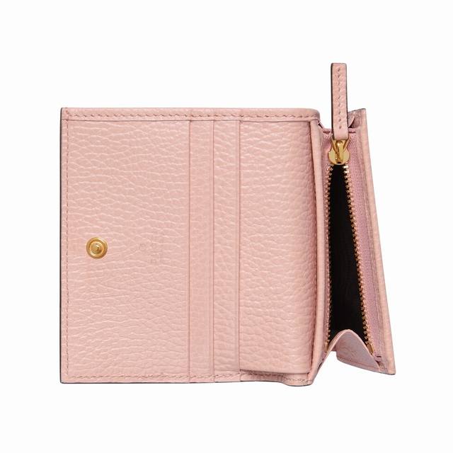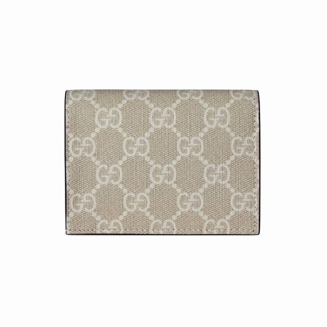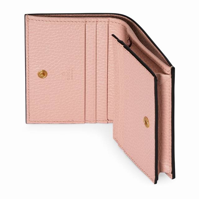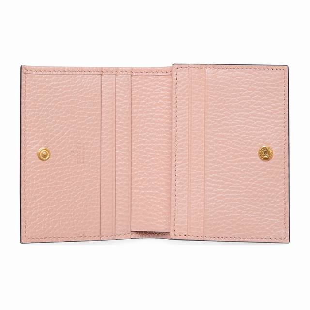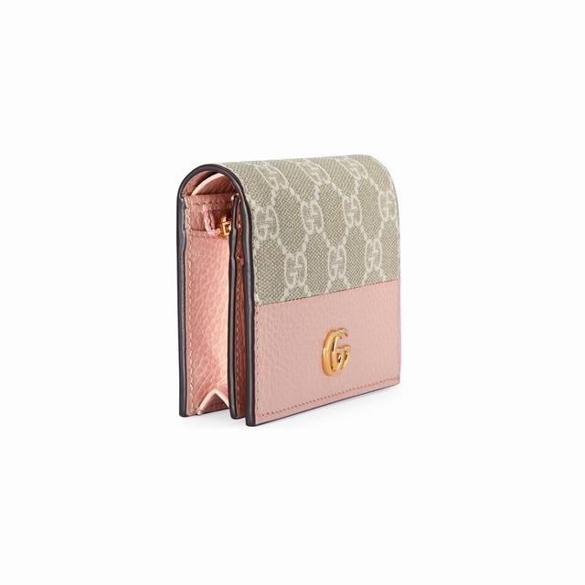 This top-of-the-line card holder features a mix of the brand's classic monogram canvas and glossy light pink leather, with five card compartments and an internal pocket, adding to the overall volume. This piece is ingeniously embellished with a miniature version of the iconic Double G-shaped hardware, adding an eye-catching piece to the Gg Marmont collection.
