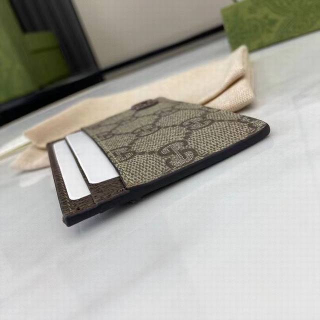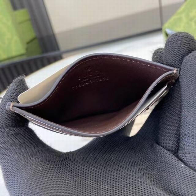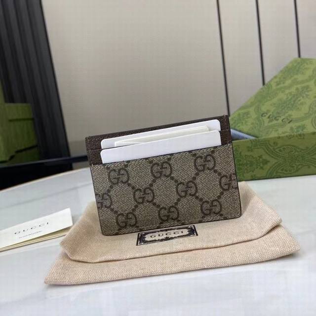 Top-of-the-line new Gg detail card holder. This card holder is crafted from beige and ebony Gg Supreme canvas, showcasing the brand's heritage details with elegant sophistication. Small blue Gg hardware details add a touch of brightness to the overall design. This piece features four card compartments, enhancing its overall appeal. Beige and ebony Gg Supreme canvas, brown leather piping, brass hardware with brown ceramic effect finish, cloud-patterned fabric lining, Gg details, four card compartments, one open pocket. Weight: approx. 0.03 kg. Model: 768248. Dimensions: 10cm (L) x 7cm (W). Color: Brown PVC. Made in Italy.