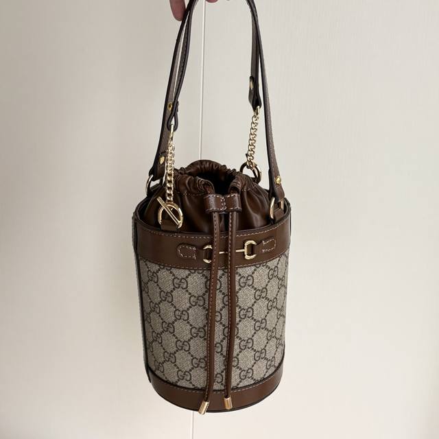 The Horsebit 1955 series introduces a new round bucket bag shape, using Gg Supreme canvas material with brown leather, and integrating deconstructed drawstring buckles, giving the series new vitality. The series draws inspiration from the collection design, inherits the design details used for the first time on the first model bag, and injects the essence of modern fashion to highlight the unique charm of the Horsebit.