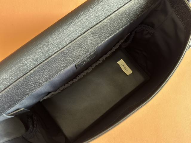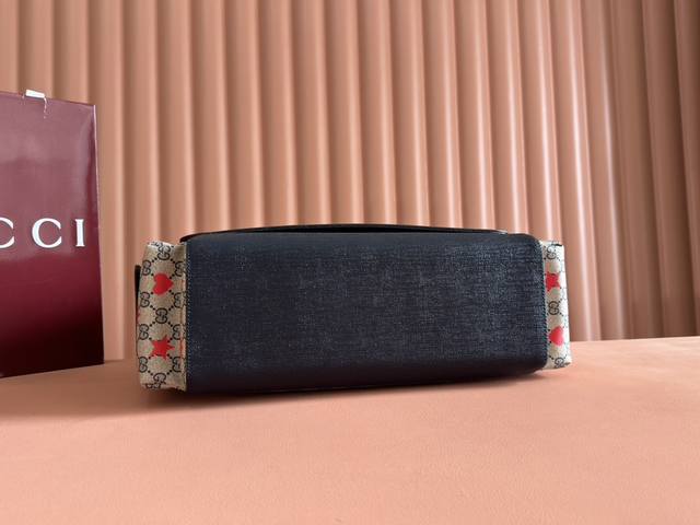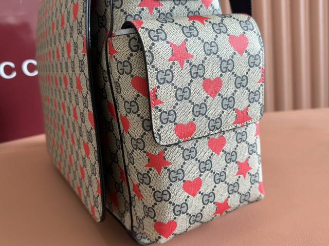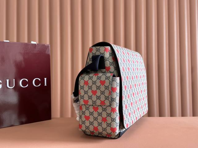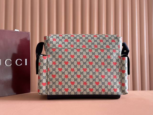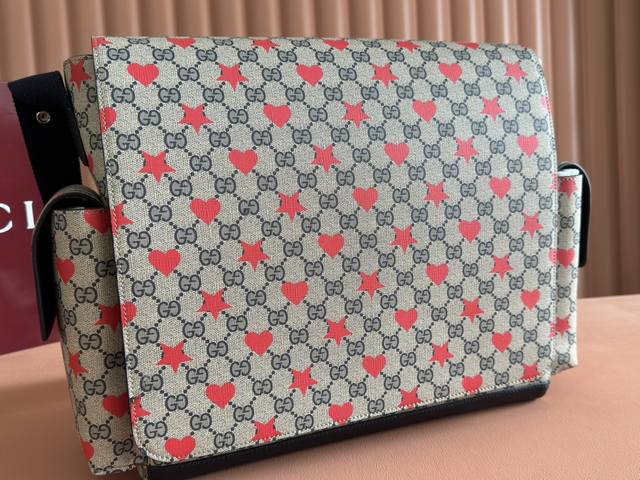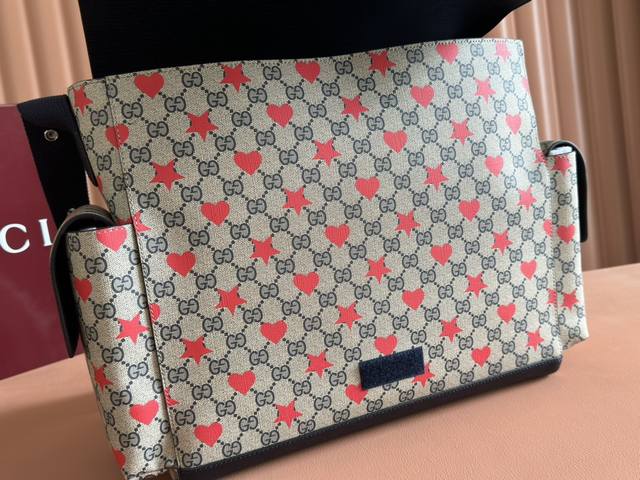 Comes with a full set of original factory gift bags. The new Children's Cruise 2025 collection presents a range of beloved themes, including iconic logo details. This diaper bag is made of Gg Supreme canvas, showcasing an all-over star and heart print, and features a navy blue ribbon. Beige and blue Gg Supreme canvas, navy blue ribbon trim, all-over star and heart print, washable nylon lining. Interior: 3 elastic opening pockets, 2 elastic water bottles. Model: 811491. Dimensions: 45 x 32 x 15 cm. Color: Starry navy blue PVC. Made in Italy.