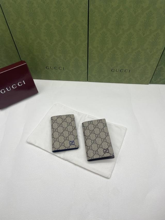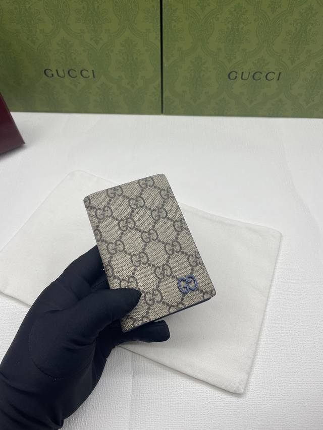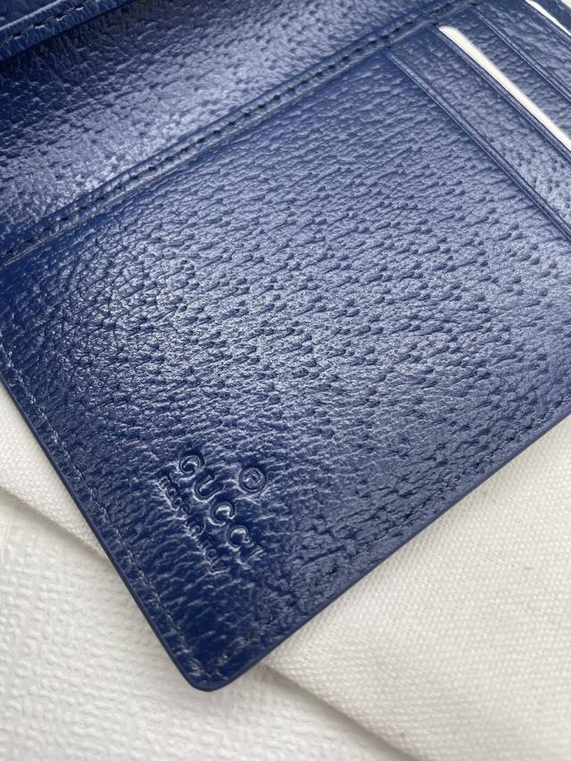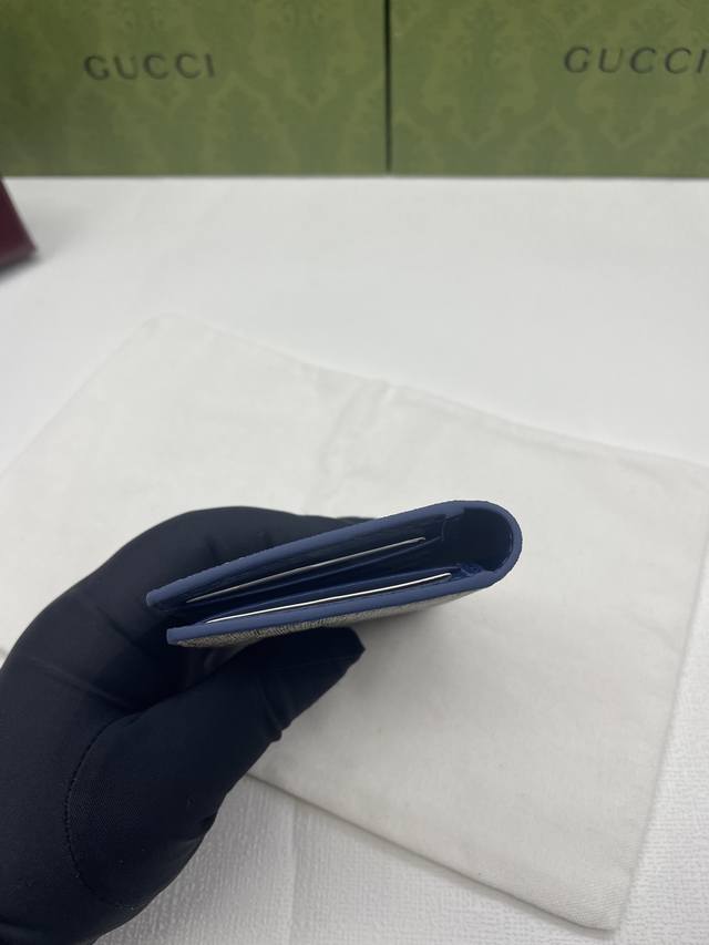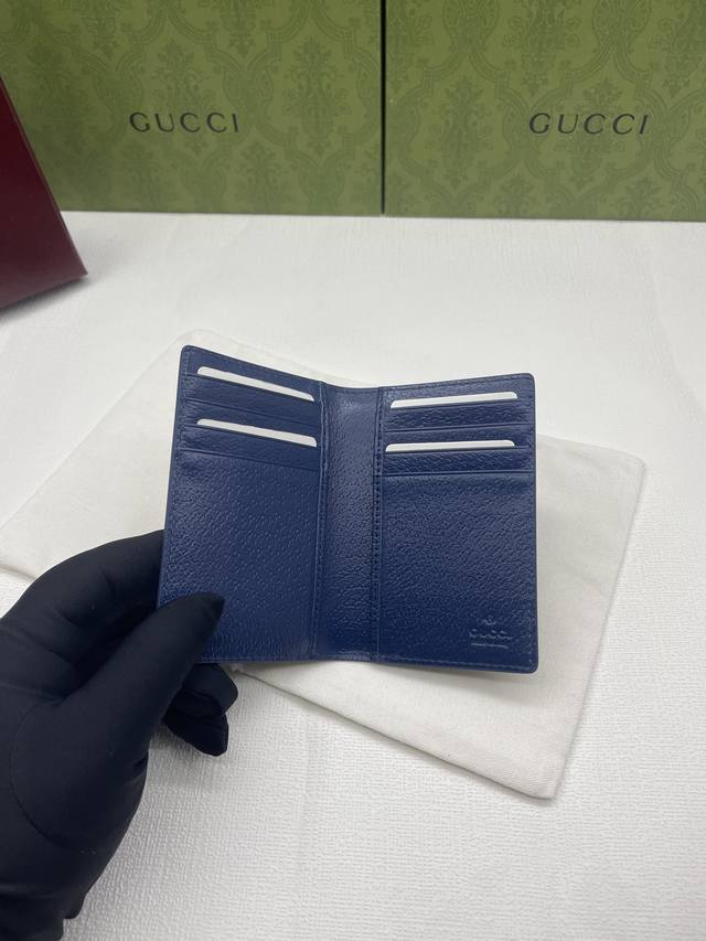 The new collection presents slim and compact leather goods, refreshed with a variety of vibrant colors. The contrasting two-tone design brings out the Gg logo adorning the bag. This long card holder is crafted from black Gg Supreme canvas with a blue leather lining and features eight card compartments. Black Gg Supreme canvas, blue leather lining, brass hardware with blue ceramic effect finish, cloud-patterned fabric lining, Gg details. Interior: Eight card compartments and two concealed compartments. Exterior: One card compartment. Model: 768249. Open dimensions: 15cm wide x 12cm high. Closed dimensions: 7.5cm wide x 12cm high. Color: Kitty blue.