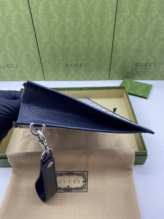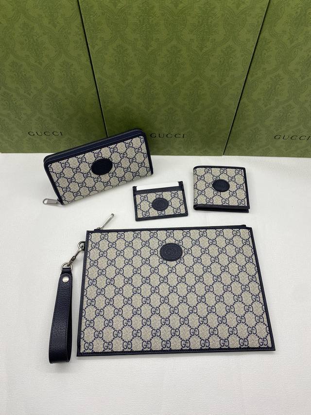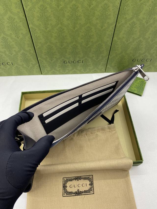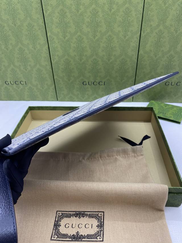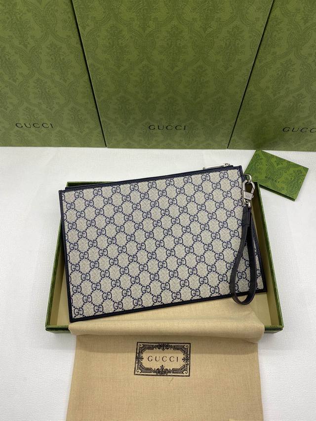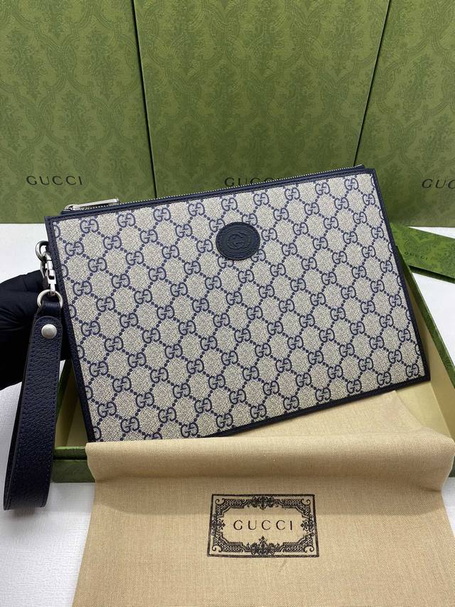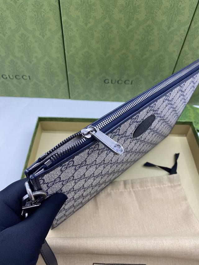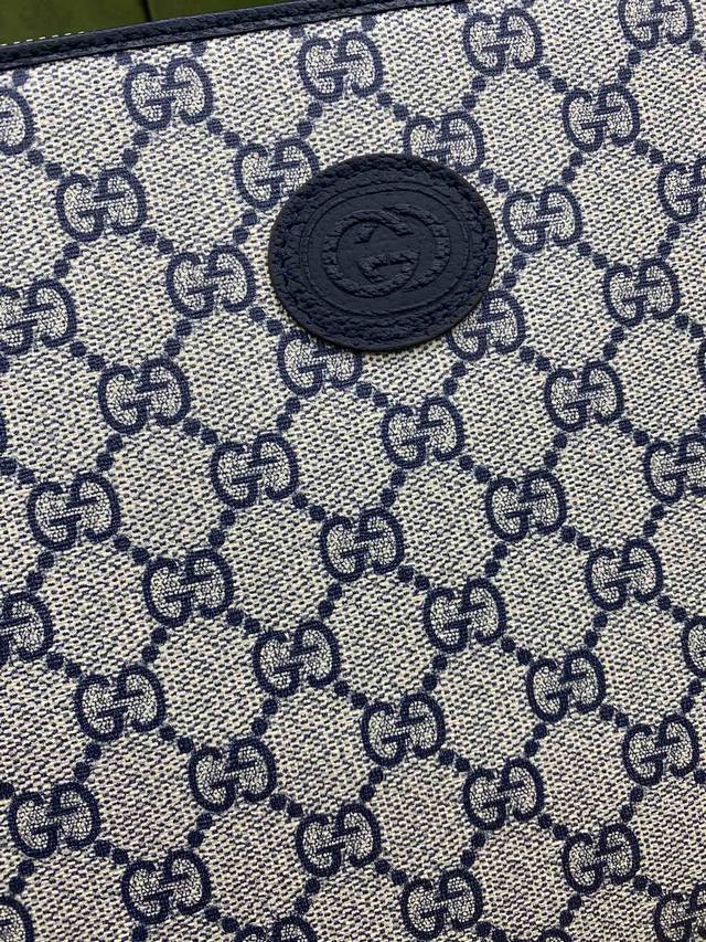 This new clutch bag comes in a green box and is made of blue Gg Supreme canvas with tonal leather trim and an interlocking double G logo, highlighting the charm of its classic design. Brown Gg Supreme canvas, an environmentally friendly material. Brown leather trim. Viscose lining. Oval interlocking double G leather logo. Detachable handle. Dimensions: 30.5*21*1.5Cm. Color: Blue PVC. Model: 672953.