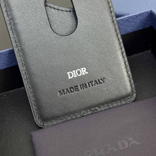 This saddle-shaped magnetic card holder is an elegant accessory showcasing the exquisite craftsmanship of the Dior atelier. The Dior Gravity printed leather features an embossed design that delicately presents the classic Dior pattern on cowhide leather, while the card slots display the classic saddle curve, elevating its style. Elegantly designed and adorned with the Dior logo, it can be paired with a Magsafe phone case. Features include: 1 card slot, front with brass-plated Dior logo, interior with embossed Dior logo, includes a dust bag, Made in Italy, dimensions: 6.5 x 9.5 cm (L x H), item number: 8009, and can hold bank cards.