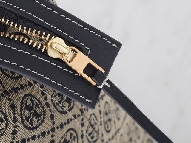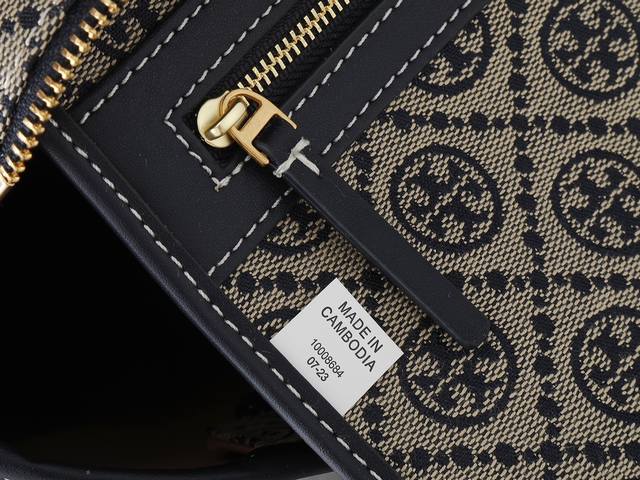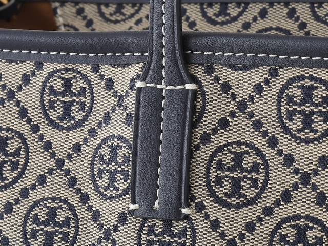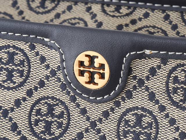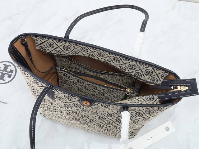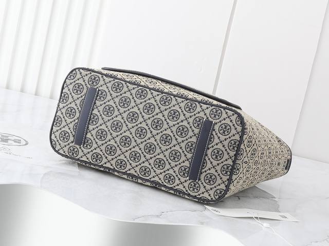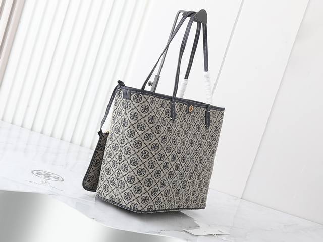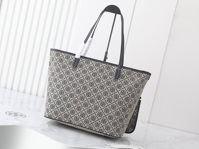 Large Tory Burch Monogram Shopping Bag. The Monogram pattern, jacquard double T logo, and flowing lines create a sophisticated yet gentle look. Simple, clean, and timeless, this tote bag is crafted from select woven jacquard fabric. Small size suitable for laptops 13 inches and under; Large size suitable for laptops 15 inches and under. Large bag: Fabric: Fabric; Lining: Synthetic leather. Small bag: Fabric: Fabric; Lining: Synthetic leather. Zipper closure. Handles, vertical carrying height 23.5cm. One internal hanging zippered pocket. Detachable zippered pocket. Small size: Height 23cm; Opening length 35.5cm; Width 13cm. Large size: Height 30cm; Opening length 44cm; Width 17cm.