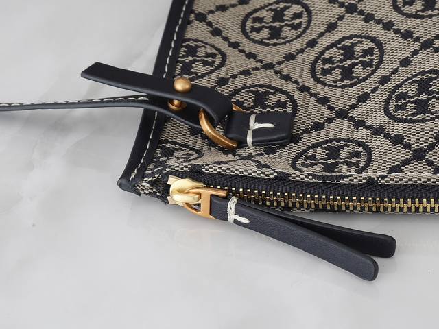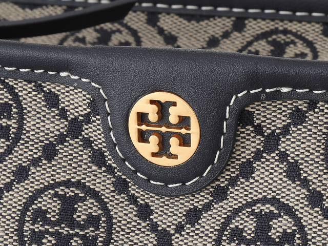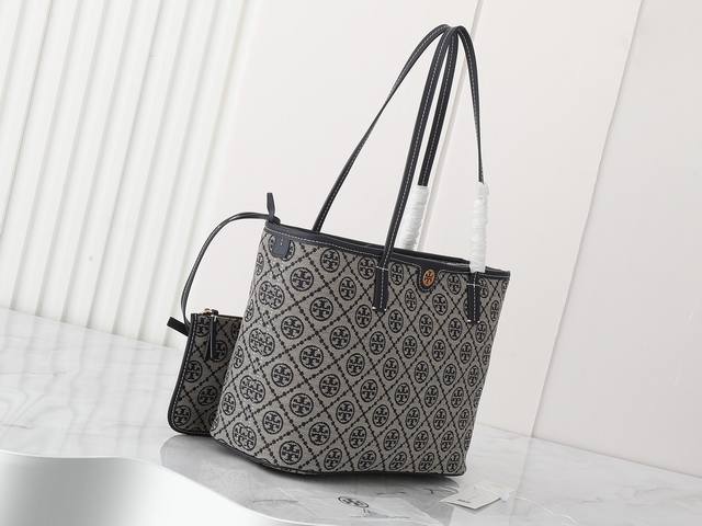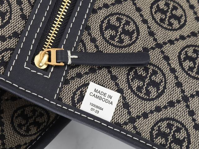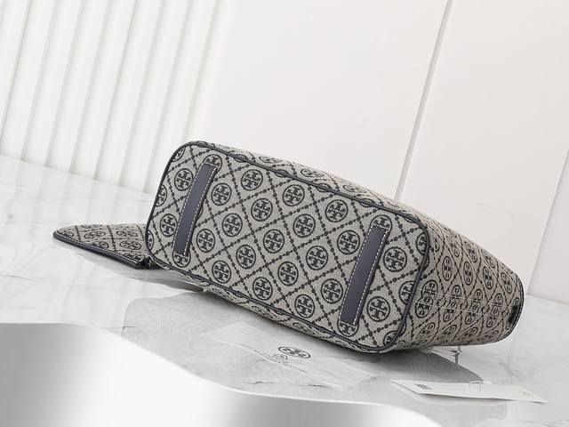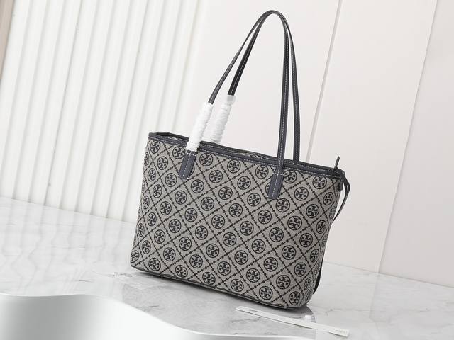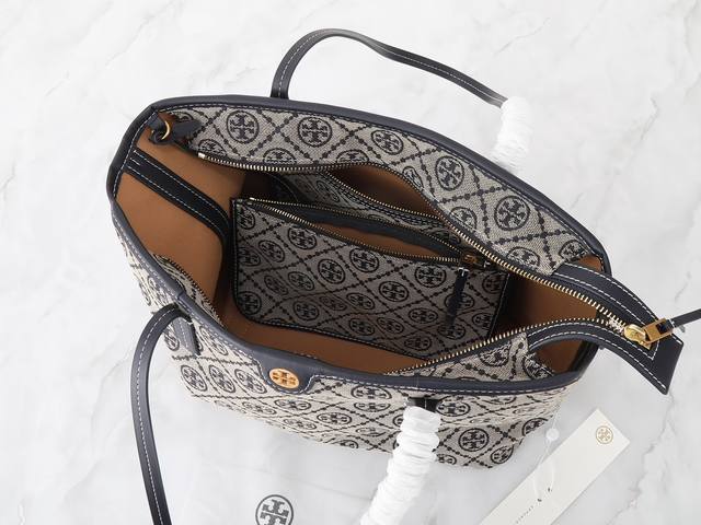 Small Tory Burch Monogram Shopping Bag. The Monogram pattern, jacquard double T logo, and flowing lines create a sophisticated yet gentle look. Simple, clean, and timeless, this tote bag is crafted from select woven jacquard fabric. Small size: Suitable for laptops 13 inches and under. Large size: Suitable for laptops 15 inches and under. Large bag: Fabric: Fabric; Lining: Synthetic leather. Small bag: Fabric: Fabric; Lining: Synthetic leather. Zipper closure. Handles, vertical carrying height 23.5cm. One internal hanging zippered pocket. Detachable zippered pocket. Small size: Height 23cm; Opening length 35.5cm; Width 13cm. Large size: Height 30cm; Opening length 44cm; Width 17cm.