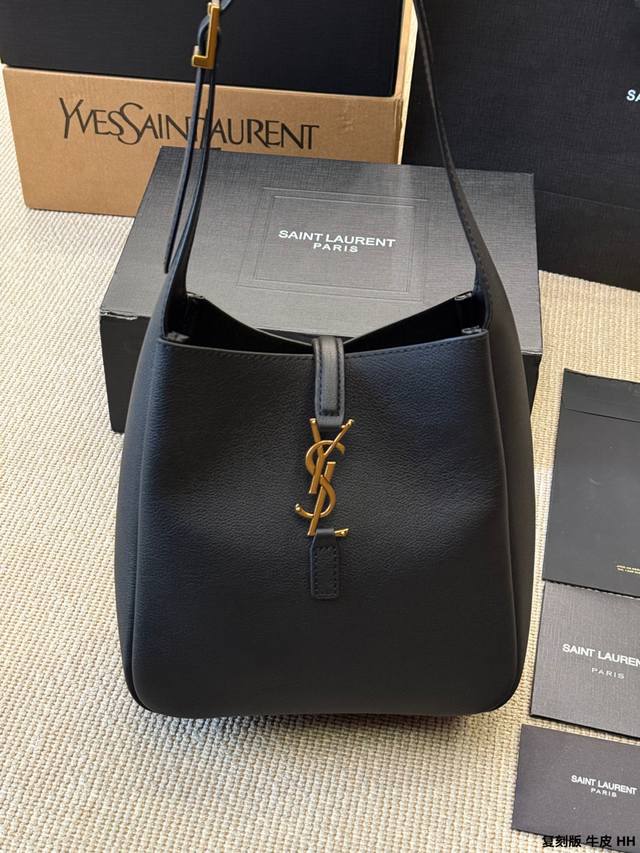 Replica YSL Le 5 A 7 Hobo Handbag in Black Calfskin Leather. This YSL Le 5 A 7 Hobo handbag features black calfskin leather with a gold logo, exuding a simple yet sophisticated style*. The soft material and structured bottom provide a moderate capacity, suitable for both commuting and everyday wear. The adjustable shoulder strap allows for easy hand-carrying or shoulder-carrying, combining practicality and style. The interior features zippered compartments for convenient organization; a DuPont paper liner is recommended for added wrinkle resistance and durability. The classic black and gold color scheme is versatile and easy to match, suitable for both work and casual occasions. It's a popular and best-selling YSL item! (Dimensions: 30cm x 21cm)