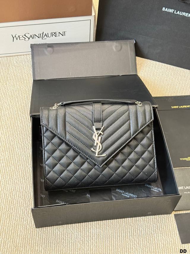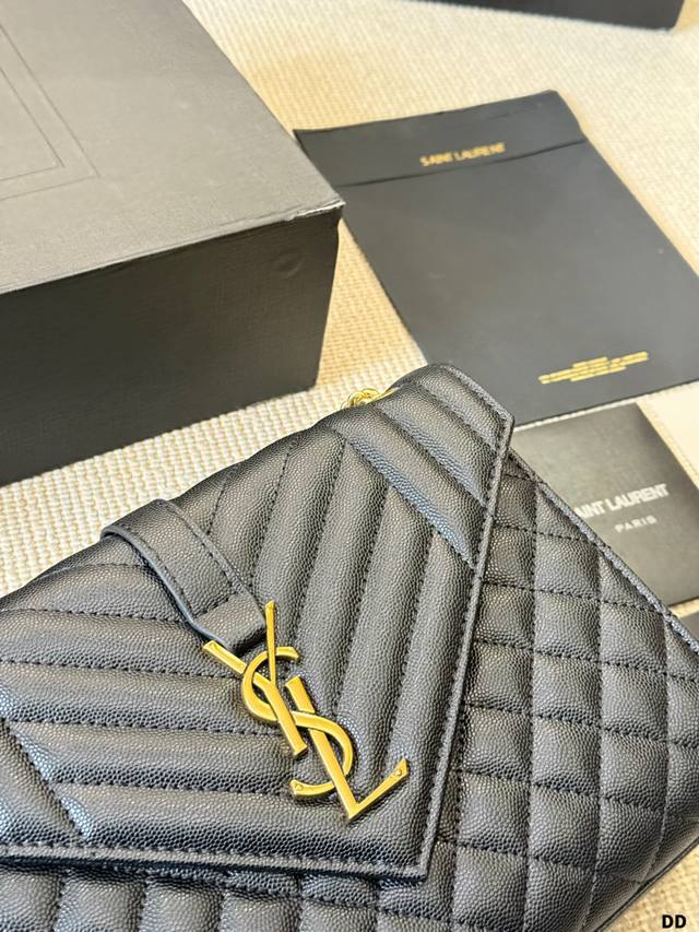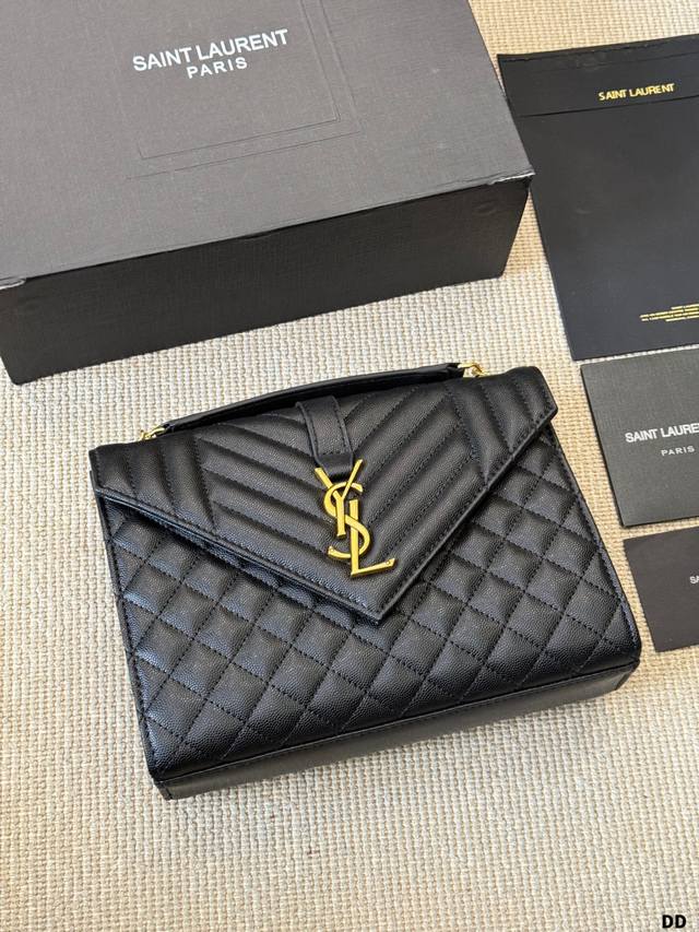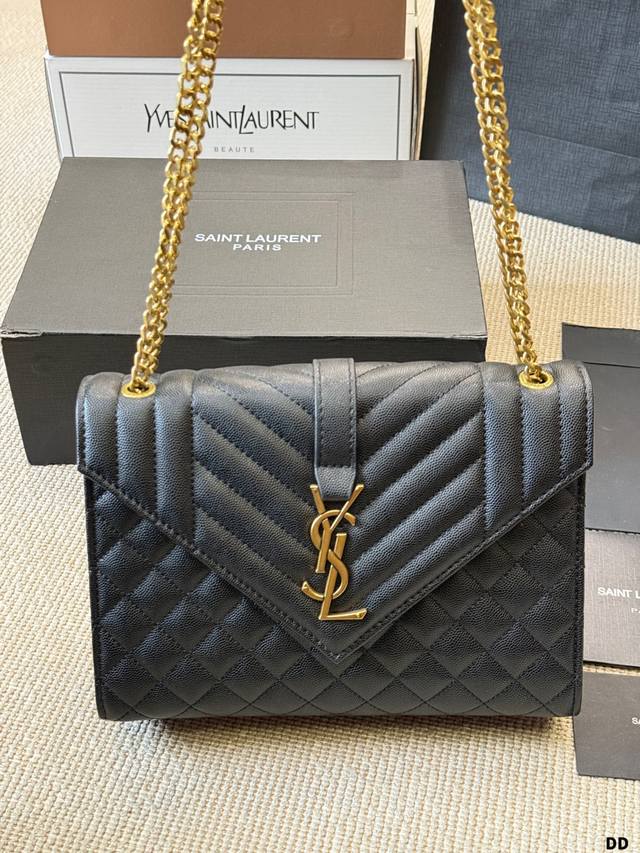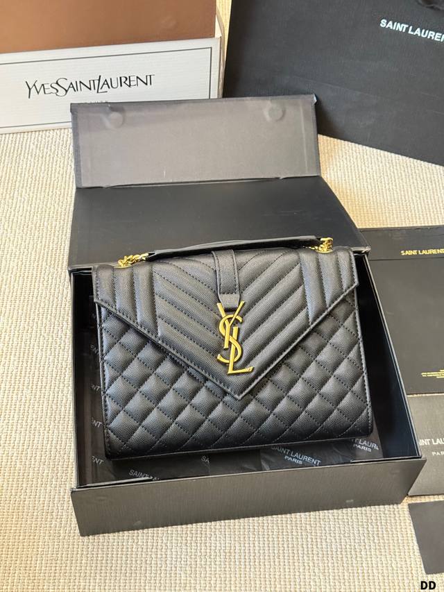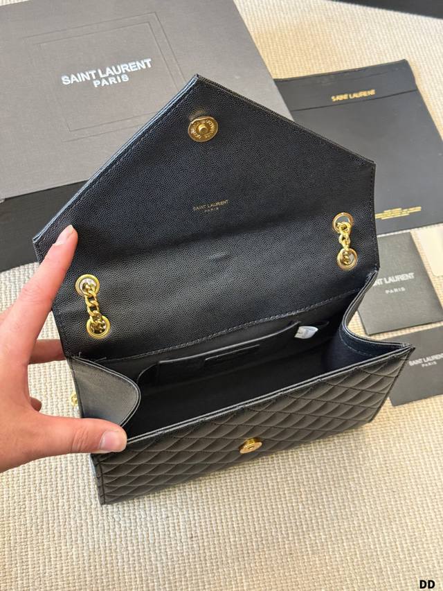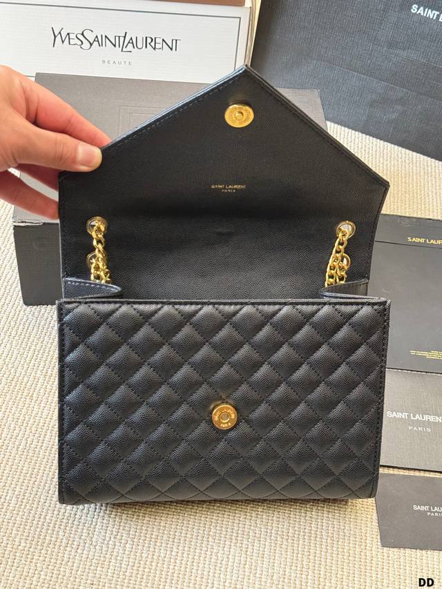 YSL Envelope Envelope Bag Ddd The YSL Envelope black and gold envelope bag features caviar leather and a metal YSL logo, with a diamond-quilted design for a luxurious feel. It has a magnetic closure, chain and leather straps, and can be worn over the shoulder or crossbody, making it suitable for both commuting and formal occasions! The medium size offers ample capacity for everyday storage. The black and gold color scheme is understated yet luxurious, versatile, and universally flattering. A classic and popular YSL design, a must-have for fashionistas! DDD