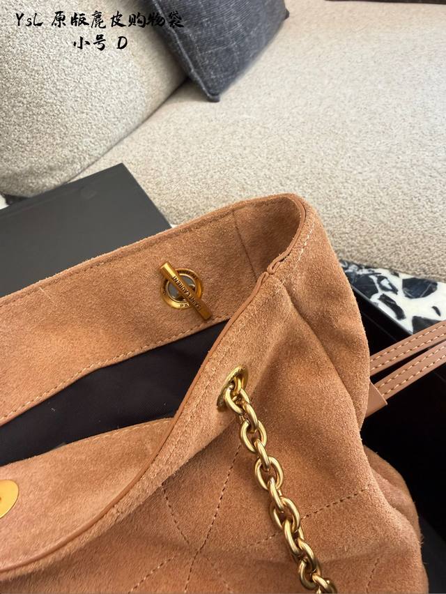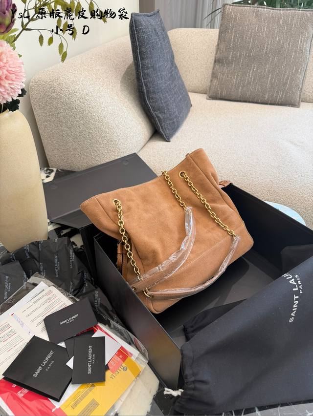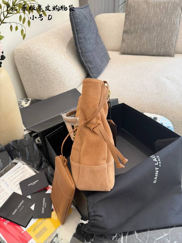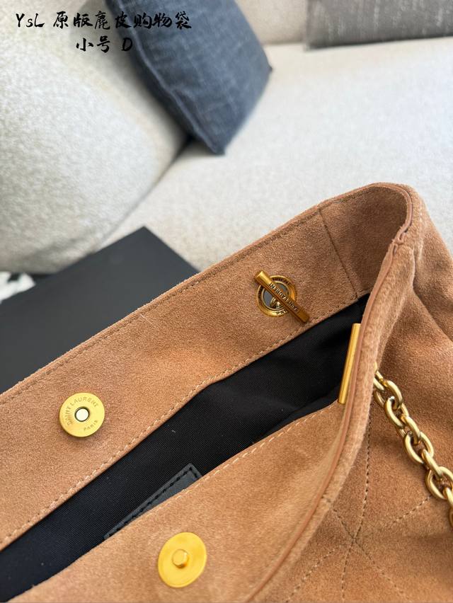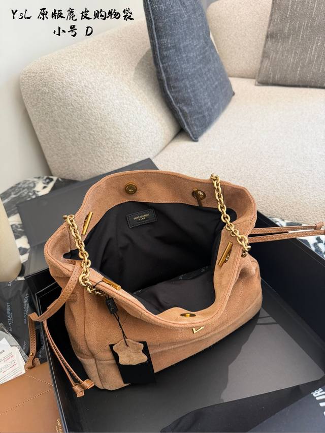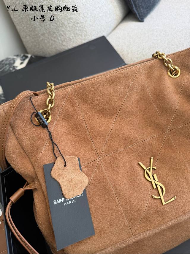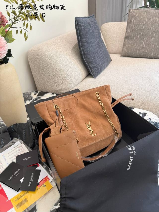 ) This Saint Laurent Jamie suede lucky bag is a limited autumn/winter edition. It features warm sand-colored suede and a brass chain, exuding a retro yet sophisticated feel. The drawstring closure and embroidered YSL logo add a touch of detail. It's spacious, making it perfect for commuting or outings. It pairs stylishly with coats or jeans, easily creating a vintage-inspired look. Please note that suede is waterproof and stain-resistant; professional cleaning is recommended. 27 x 29 cm, complete packaging (