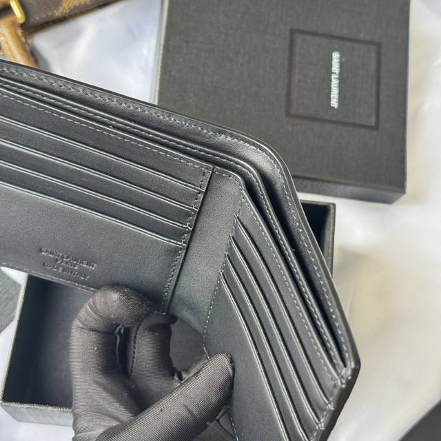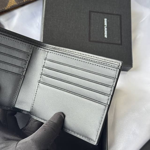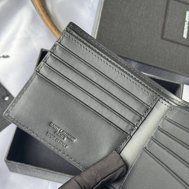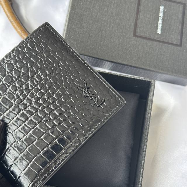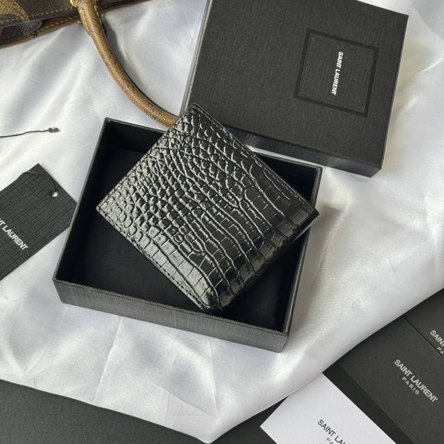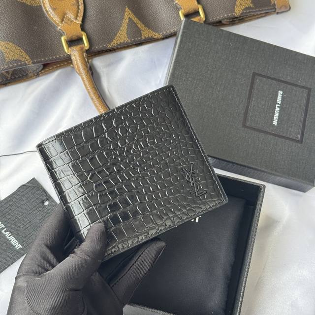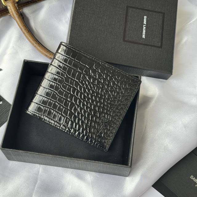 Authentic YSL Men's Wallet, Black Crocodile Pattern, Made of Leather Monogram Bi-fold Wallet with Metal YSL Logo. Interior: Two bill compartments, eight card slots, and two note compartments. Model: 607727. Dimensions: 11*9.5*2.5cm.