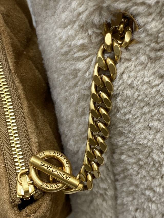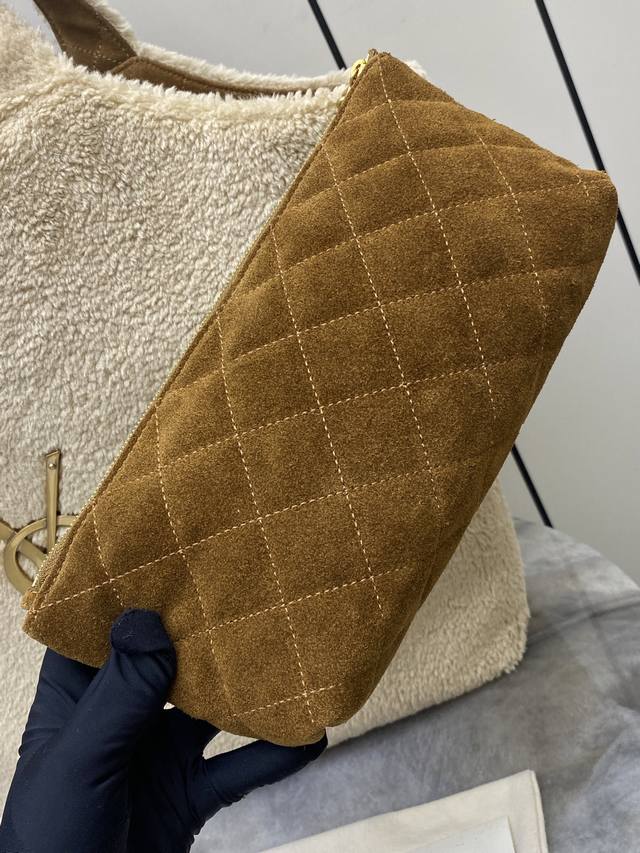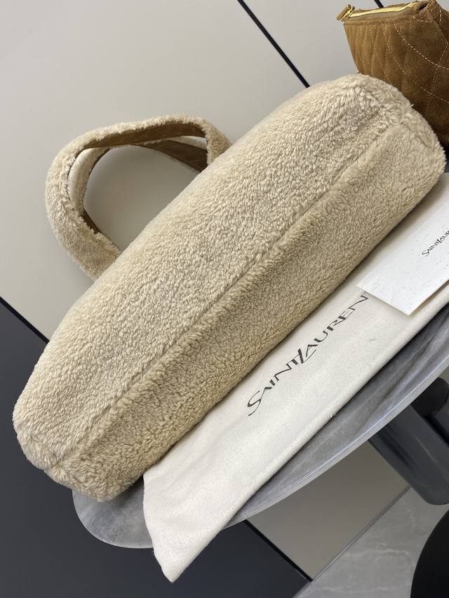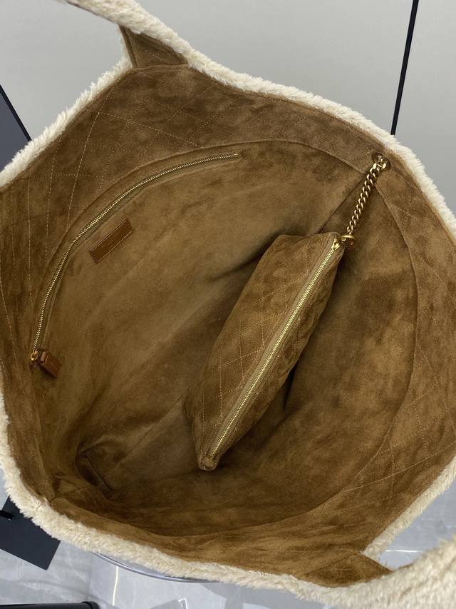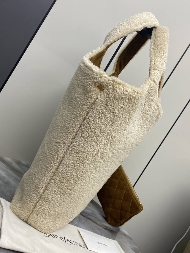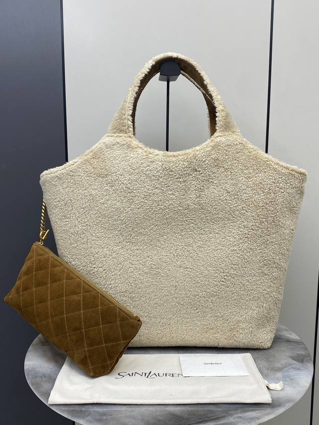 Original Leather YSL Icare Plush Tote Bag in Creamy White Lambswool with Gold accents. Made of soft lambswool with a suede lining, this bag is incredibly warm and a must-have for autumn and winter! The large YSL metal logo on the front is highly recognizable. Measuring approximately 43 x 36 cm, it's spacious enough for commuting or short trips. It includes a detachable clutch for convenient and organized storage. The plush design is versatile and easily complements both casual and warm outfits, exuding a French romantic vibe! Code: 698651 Original Leather Size: 38 x 58 x 43 x 8 cm